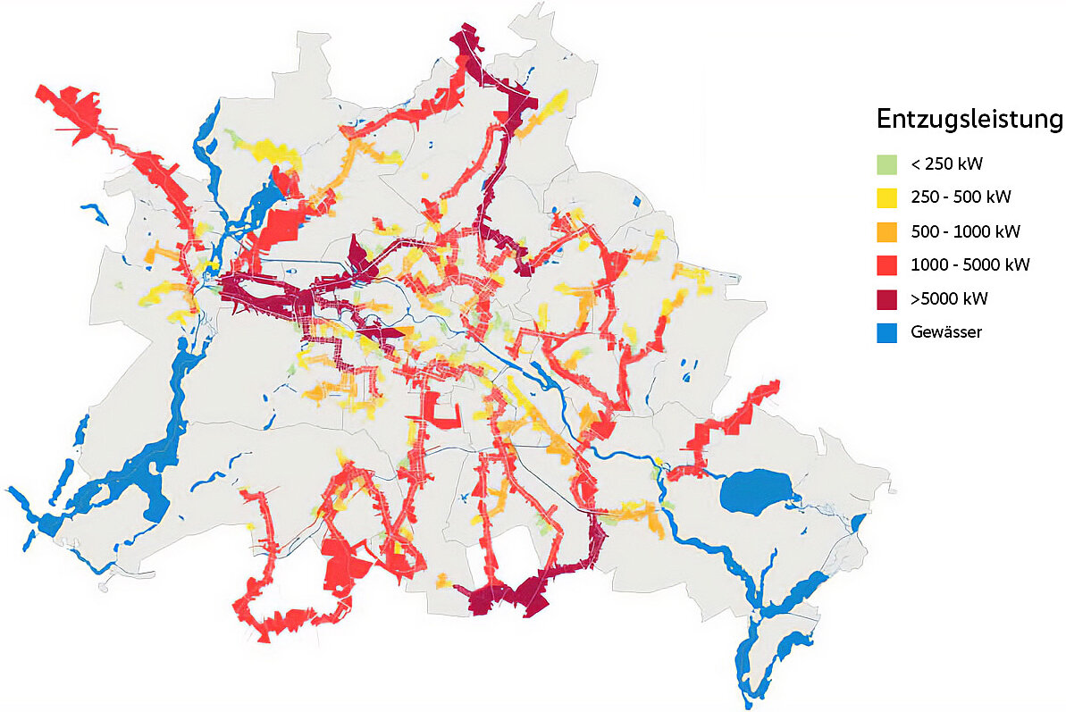 Schließlich bleibt die Abwasserdruckleitung, die unter der Marksburgstraße verläuft. Was hier fließt, hat selbst bei Dauerfrost noch eine Temperatur von mindestens 12 Grad. Wärmetauscher in der Kanalisation entnehmen davon vergleichsweise geringe Mengen. Sie entsprechen etwa einem bis drei Grad Celsius. Mit Strom betriebene Wärmepumpen heben diese Wärmeenergie in den Häusern auf eine normale Warmwasser- und Heiztemperatur. Die Berliner Wasserbetriebe haben in einem weiteren Forschungsprojekt den Abwasserwärmeatlas (siehe Abbildung) erstellt und kennen ihre Potentiale. Eine Analyse ergibt: Die HOWOGE kann am Quartier Q1 theoretisch so viel Wärmeenergie aus dem Abwasser entnehmen, dass der Bedarf in den Häusern auch bei gegebenem Sanierungsstand vollständig zu decken ist.