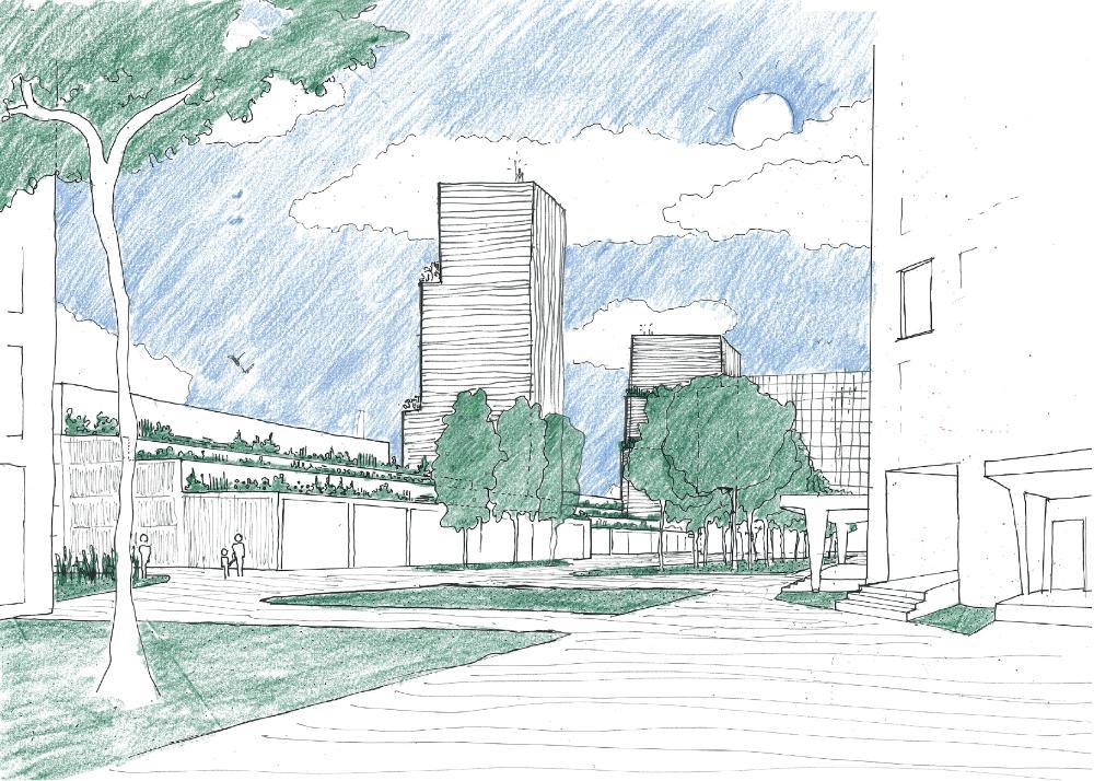 Die neuen Gebäude entlang der Vulkanstraße werden von einem ausgedehnten Baumdach umgeben, das auf einem 8 x 8 m großen Raster basiert. Dies gewährleistet die Schaffung einer einheitlichen Landschaft, die schattige Kontinuität entlang der Rad- und Fußgängerwege bietet und Zugangs- und Verkehrsbeschränkungen für Feuerwehrautos, Fahrzeuge usw. berücksichtigt, während gleichzeitig der Eindruck verstärkt wird, sich in einem großen Park zu befinden. Wo immer möglich werden zusätzliche Vegetationsschichten angelegt, um die Landschaft der weitläufigen Gärten aus dem Westen zu erweitern.