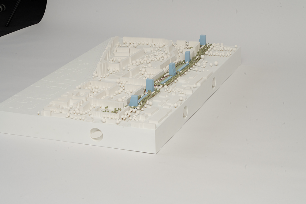 Entlang der Vulkanstraße schlägt unser Projekt an fünf strategischen Punkten städtebaulich klar verankerte und entsprechend ihrer kontextuellen Einbettung orientierte Hochhäuser vor. In ihrer Positionierung beeinflussen sie den Ausblick und die Belichtung des Bestands nur minimal. Die 20-geschossigen Türme greifen die im Quartier bereits bestehende Hochpunkt-Typologie auf und ergänzen damit das bestehende Ensemble aus drei Hochhäusern nördlich der Landsberger Allee, dem Punkthochhaus am Roederplatz, den Hochhäusern im Fennpfuhlpark sowie dem Hochhaus an der Ecke Möllendorff-/Storkower Straße.