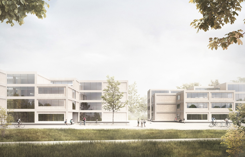 Der Wettbewerbsbereich, im Bezirk Lichtenberg situiert, entfaltet seine Ambivalenz vor allem durch seine Position: zwischen großmaßstäblichen Plattenbauten, vereinzelten Solitären und einem zu schützenden Waldgebiet. Ziel des Entwurfs ist es, mit einem neuen Gebäudeensemble als Schul- und Sporthallenneubau das im Wandel befindliche Quartier zu strukturieren und zu stärken und die rurale Qualität – zwischen Natur und Urbanität – mit einer neuen Adresse zu definieren. Der städtebaulich 3-/4-geschossige, abgestufte Schulbau an der Allee der Kosmonauten lässt so eine neue, stadträumliche Sequenz entstehen und bettet sich behutsam in das vorhandene Waldgebiet ein. Die Ausformulierung der Baukörper sieht die Schule als gebauten Organismus, dessen Teile eng miteinander kommunizieren und graduelle Übergänge zwischen Aktivität und Rückzug, Öffentlichem und Geschütztem, Sport und Erholung schaffen. Wichtig sind auch die Bezüge der formalen und strukturellen Analogien zur Landschaft, jedoch gepaart mit einem stringenten, effizienten Konstruktionsraster.
