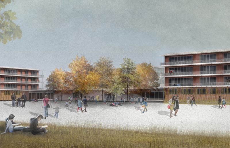 Den besonderen städtebaulichen Rahmenbedingungen aus den Aspekten des Natur- und Klimaschutzes als auch des Lärmschutzes zur Straße wird wie folgt begegnet: Es werden ab dem 1. OG nur Einzelbaukörper entwickelt, um eine hohe Luft- und Winddurchlässigkeit zu erreichen. Die Gebäudehöhen werden auf max. vier Vollgeschosse begrenzt. Der Bestands-Gehölzstreifen in Schulhofmitte wird auf seine großen Einzelbäume reduziert und impulsgebend mit Baum-Neupflanzungen ergänzt, so dass für den Schulhofbereich insgesamt eine parkähnliche Freifläche entsteht. Der südliche Grundstücksbereich nimmt die erforderlichen Sportflächen auf.