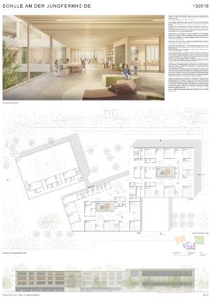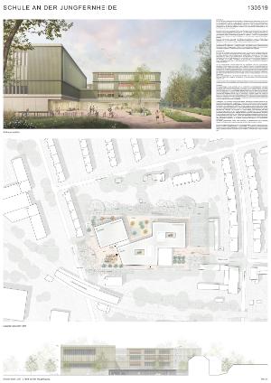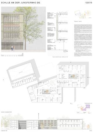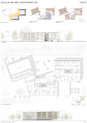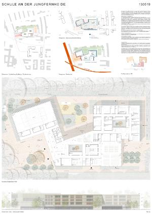 Die Schule an der Jungfernheide ist als viergeschossiges, nicht unterkellertes Gebäude geplant. Der Baukörper ist dreigliedrig, im nordwestlichen Gebäudeteil befinden sich die gestapelten Sporthallen, im mittleren Baukörper sind im Erdgeschoss die halböffentlichen“ Nutzungen wie Foyer, Mensa, Mehrzweckraum, sowie in den Obergeschossen die Sekundarstufe I vorgesehen. Im östlichen Gebäudeteil befinden sich im Erdgeschoss die Lernwerkstätten, im ersten und zweiten Obergeschoss die Primarstufe und im dritten Obergeschoss die Sekundarstufe II. Die horizontale Staffelung in Sockel und Hauptbaukörper lässt die funktionale Organisation mit den halböffentlichen Nutzungen im Erdgeschoss erahnen.
