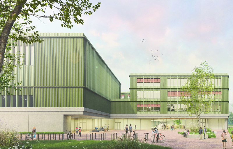 Roter Klinker prägt das städtische Umfeld der Siemensstadt mit seinen historischen Bauten. Der Schulneubau an der Jungfernheide wird im hierzu komplementären Farbspektrum mit einer grünlich lasierten Holzfassade vorgeschlagen und soll im Zusammenhang mit dem bereits vorhandenen rahmenden grünen Baumbestand sowie den vorgeschlagenen ergänzenden Bepflanzungen einen eigenständigen Charakter erhalten.