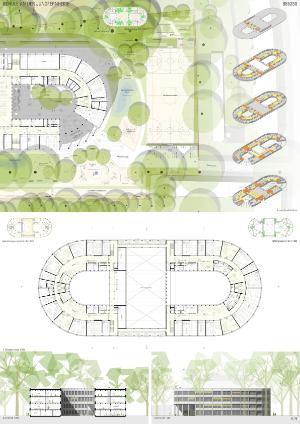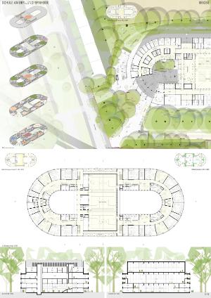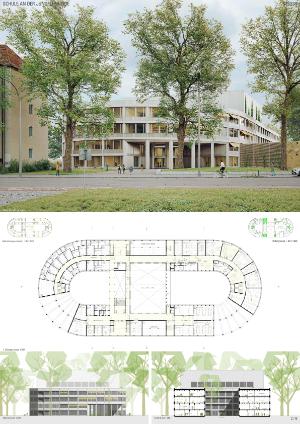 Das neue Schulhaus zeichnet die Form des ehemaligen Sportplatzes nach. Ein viergeschossiger Ring aus Unterrichtsräumen umfasst einen Zentralbau, der erdgeschossig Eingangshalle, Aula und Mensa aufnimmt, darüber zwei gestapelte Dreifachsporthallen. Dieser höhere Baukörper beinhaltet auch die Haupterschließung und trennt Schul- und Eingangshof, Primar- und Sekundarbereich. Im markanten Halbrund der beiden Gebäudeköpfe öffnen sich die Höfe jeweils doppelgeschossig und strahlenförmig nach außen – der Eingangshof macht zum Rohrdamm hin eine einladende Geste; der Schulhof erweitert sich analog in die südlich angrenzenden Außenanlagen der Schule und zum Nebeneingang von der Goebelstraße. Der wertvolle Baumbestand wird weitestgehend erhalten und ergänzt. Der Skelettbau in Stahlbeton-Holz-Hybridbauweise ist nachhaltig, flexibel und wirtschaftlich zu realisieren.