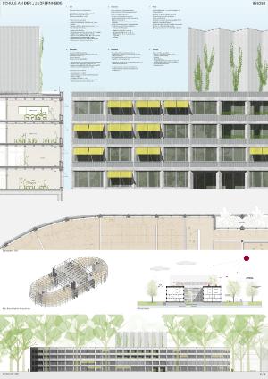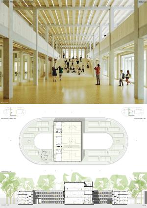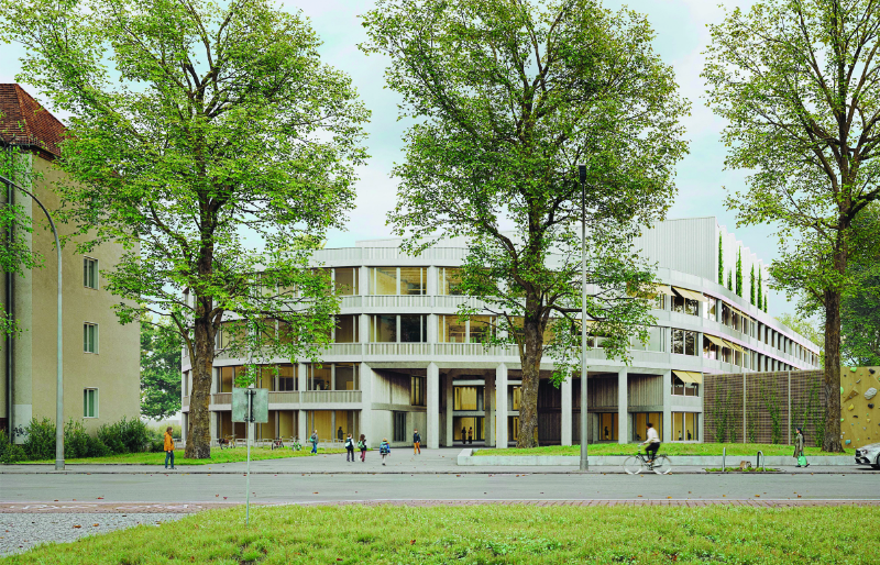 Der kompakte Baukörper hat einen geringen Fußabdruck, ein gutes A/V-Verhältnis und erlaubt es, einen Großteil des Baumbestandes zu erhalten. Das äußerst effiziente, serielle Tragwerk erlaubt zukünftige Nutzungsanpassungen und ist sowohl im Hinblick auf die Reduktion des CO2-Verbrauchs als auch in wirtschaftlicher Hinsicht günstig. Der Bauablauf wird durch den Einsatz vieler Fertig- und Gleichteile in Rohbau, Fassade und Ausbau beschleunigt. Die leichte, vorgehängte Fassade ist robust, besteht aus austauschbaren Standard-Produkten und reduziert Wärmebrücken. Beim Ausbau kommen wenige naturnahe und strapazierfähige Materialien zum Einsatz, die gut altern und Patina ansetzen können. Sowohl die Fassade als auch der Ausbau können weitestgehend sortenrein rückgebaut und wieder in den Materialkreislauf eingespeist werden.