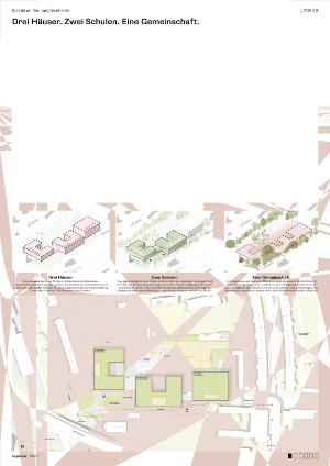 In dem Ensemble hat jede der beiden Schulen einen eigenen Eingang und einen eigenen Baukörper – einen für die Jüngeren, einen für die Älteren. So erhalten beide Schulen eine klare Identität und verfügen dank des zentralen Erschließungskerns über eine kompakte, überschaubare Struktur mit guter Orientierung und direktem Ausgang zum Park.