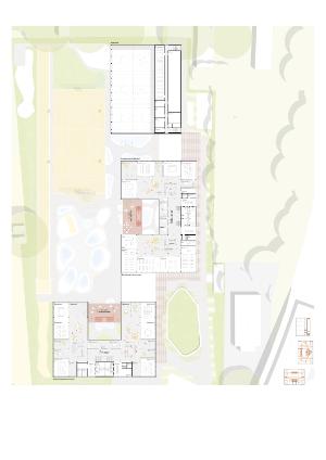 Ein mehrgeschossiges Gerüst erweitert den Schulhof zu einem offenen, räumlich gefassten Möbel und schafft Platz für Bewegung, Aufenthalt, Rückzug und Begegnung. Plattformen, Sitzbereiche, Nischen, zweigeschossige Lufträume, begrünte Elemente und gezielte Durchblicke strukturieren den Raum und sorgen für Licht, Luft und Orientierung. In der Primarschule entwickelt sich das Möbel zur Spiel- und Bewegungslandschaft mit Kletterelementen und Rutschen, während es in der Sekundarschule als sozialer Raum mit Treffpunkten und Rückzugsorten genutzt wird.