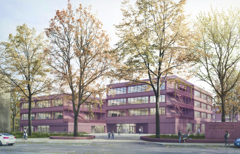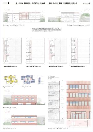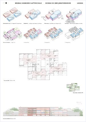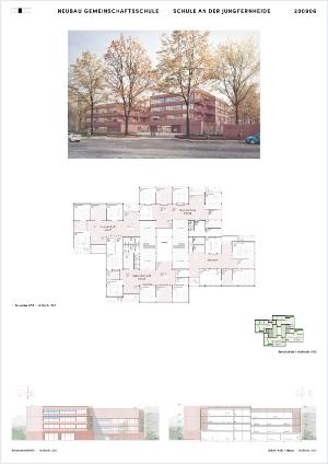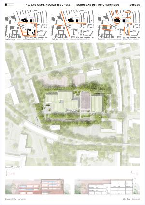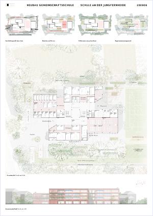 Der Erweiterungsneubau der Schule an der Jungfernheide besteht aus vier höhengestaffelten Bausteinen, die sich um eine gemeinsame Mitte gruppieren. Die leichte Verschiebung der Bausteine zueinander bildet einen gefassten Vorplatz im Südwesten und einen Ausgang zu den Pausenflächen im Nordwesten. So adressiert der Schulneubau sich signifikant in den Straßenraum, während die Positionierung der Sporthalle an der östlichen Grundstücksgrenze einen großzügigen Freiraum fasst, der wiederum durch die Geometrie des Neubaus gegliedert wird. Die prägenden Baumreihen im südlichen Grundstückbereich werden erhalten und bilden ein Rückgrat als übergeordnete fußläufige Erschließung des Grundstücks. Hier wird die Laufbahn wieder dort positioniert, wo sie bisher war. Gleichzeitig wird ein parallellaufender Fußweg außerhalb des eingezäunten Schulbereichs – teilweise als Bestandsweg auf dem Flurstück 424 - angeboten so dass eine öffentliche Durchwegung zwischen Rohrdamm und Lenther Steig ermöglicht wird.