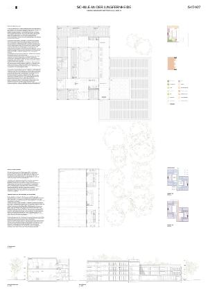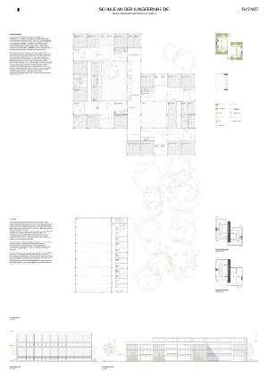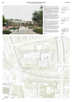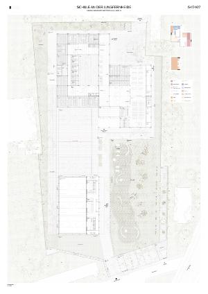 Auf dem Grundstück Nord der bestehenden Schule an der Jungfernheide im Berliner Bezirk Spandau soll ein Erweiterungsneubau und eine neue Doppelsporthalle für die wachsende Großstadt Berlin errichtet werden. Das Grundstück liegt in einem heterogenen Umfeld, das geprägt ist von großmaßstäblichen Gewerbe- und Verwaltungsbauten und dichtem Geschosswohnungsbau. Prägend sind neben dem großen, alten Baumbestand auch die Straße Rohrdamm, die für große Lärmimmissionen aus Westen sorgt. Zum Ende des Jahrzehnts soll zudem die ehemalige S-Bahnstrecke der Siemensbahn reaktiviert werden, sodass die Lärmbelastung aus Westen und Süden weiter zunehmen wird. Der Gleiskörper teilt das Gesamtschulgrundstück in zwei Teile, sodass nur über zwei Unterführungen eine Verbindung zwischen neuem und altem Schulcampus besteht.