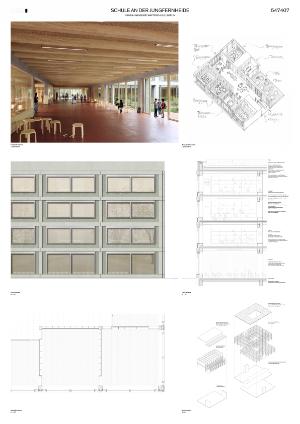 Auch im Bereich der Gebäudehülle, die hocheffizient in beiden Gebäuden im EE40-Standard errichtet wird, wird ein hohes Maß an Vorfertigung angestrebt: Durch Modularisieurng, Standardisierung und Wiederholung können die Fassadenelemente als fertige „Sandwich-Elemente“ angeliefert werden und zügig am Rohbau befestigt werden. Großformatige Festverglasung sorgen für eine optimale Beleuchtung der tiefen Lernräume; ein außenliegender textiler Sonnenschutz bietet zudem Schutz vor Überhitzung der Räume. Als Wetterhülle präsentiert sich im Gefachbereich neben der Verglasung eine hinterlüftete, robuste Wellblechfassade, die aus rezyklierten Elementen hergestellt wird und mit einem egalisierenden und korrosionsschützenden Anstrich versehen wird. Innerhalb der Wellblechfassade werden Perforationen zur Lüftung über dahinterliegende, öffenbare Fenster vorgesehen. Im Bereich vor den Randbalken, der Deckenstirn und vor den vertikalen Stützen wird eine Fertigteilfassade vorgesehen, die extrem robust und dauerhaft ist. Die Fassade des Schulgebäudes ist somit nahezu wartungsfrei. Das Dach wird als „0-Gefälledach“ mit hohem Retentionsvolumen ausgelegt und vollständig extensiv begrünt und mit einer Photovoltaikanlage ausgestattet.