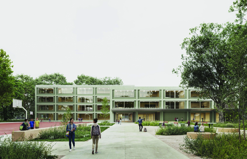 Der Schulneubau ist als Hoftypus entwickelt: Zwei Baukörper mit Innenhöfen werden aneinandergereiht, sodass durch die Höfe eine gute Belichtung und Belüftung, aber auch abseits des Außenlärms ruhige, geschützte Außenräume entstehen. Zur Verbesserung der Belichtung und zur differenzierten städtebaulichen Gliederung des Hauses, werden diese zueinander verschoben und verschmolzen. So entsteht eine größere Fassadenabwicklung, die eine hervorragende Versorgung mit Tageslicht und Frischluft trotz der großen Baukörpertiefe ermöglicht. In der Höhe ist der südliche Bauteil drei- und der nördliche Bauteil viergeschossig.