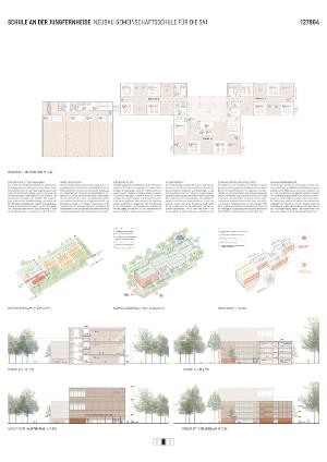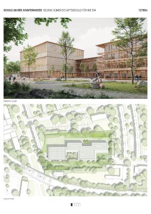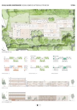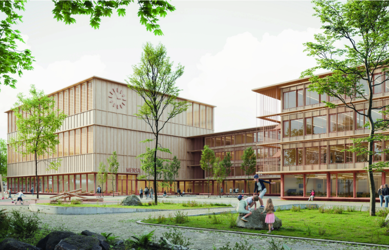 Den größten Freibereich bildet schließlich der nördliche Schulhof, der sich – entsprechend der inneren Organisation der Schule – in einen westlichen Bereich für Sekundarschüler:innen und einen östlichen Bereich für die Primarschüler:innen aufteilt. Beide Bereiche werden altersgerecht mit Aktivitätsangeboten, Aufenthalts- und Kommunikationsberichen sowie Naturerfahrungs- und erlebnisräumen ausgestattet. Der Schulgarten als „Grüne Oase“ sowie ein grünes Klassenzimmer sind in den westlichen Schulhof integriert. In der Mitte liegt das Multifunktionsfeld, das neben seiner Schulsportnutzung in den Freizeiten allen Altersgruppen zur freien Verfügung steht. Die Laufbahn und Gymnastikwiese schließen nördlich daran an.