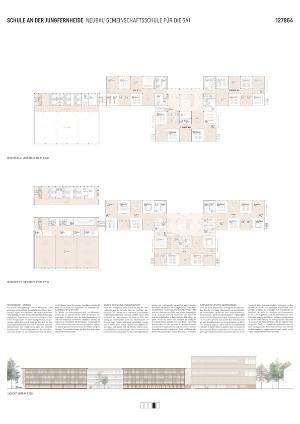 Angebunden an die „Schulstraße“ liegen die Vertikalerschließungen mit den beiden barrierefreien Haupterschließungskernen, die in die oberen Geschosse der Schule vermitteln: Im 1. Obergeschoss, welches durch einen Luftraum in direkter Blickbeziehung zum Haupteingang und zur Aula steht, befindet sich der Verwaltungsbereich sowie der zentrale Informations- und Kommunikationsraum für das pädagogische Personal. In den beiden östlichen Gebäudeteilen befinden sich je ein Cluster für die Sek II und die naturwissenschaftlichen Fachräume.