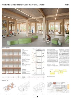 Mit Blick auf die Selbstverpflichtung des Landes Berlin, bis 2045 klimaneutral zu werden, ist das Gebäude als CO2-arme Holz-Beton-Hybridkonstruktion konzipiert. Die Sohlplatte sowie aussteifende Kerne werden in Betonmassivbauweise ausgebildet, Geschoss- und Dachdecken als Holz-Beton-Rippenverbunddecke. Der Lastabtrag erfolgt im Prinzip des Holzrahmenbaus über die Außenwände und Stützreihen zwischen den Foren und Klassentrakten. Dabei ist dem gesamten Schulgebäude ein einheitliches Konstruktionsraster von 8,60/4,30 m zugrunde gelegt, welches ideale Nutzungsflexibilität bei gleichzeitiger Reduzierung der Spannweiten und Querschnitte gewährt. Gleichwohl wäre im Sinne der Konstruktionsoffenheit selbstverständlich auch ein Beton-Skelettbau (8,60/8,60 m) möglich.