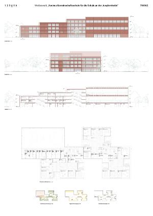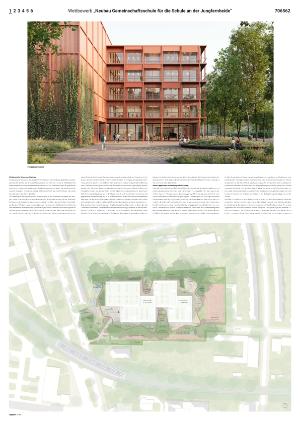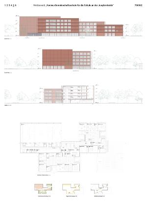 Durch die Kombination aus Adressbildung, Vorplatz und Hochpunkt entsteht eine robuste städtebauliche Figur, die nach außen präsent ist und nach innen geschützte Bereiche ausbildet. Die hohen Baukörper übernehmen dabei zugleich eine lärmschützende Funktion und ermöglichen ruhige, gut nutzbare Schul- und Freiräume im Grundstücksinneren. Nach Osten staffelt sich das Gebäude auf bis zu drei Geschosse ab und reagiert damit sensibel auf die angrenzende Wohnbebauung und KiTa. Insbesondere die beiden miteinander verschränkten Baukörper, die der Grundschule zugeordnet sind, greifen den kleineren Maßstab des Umfelds auf und bilden einen ruhigen, nachbarschaftsverträglichen Abschluss des Gesamtvolumens.