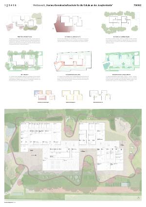 Da der Wettbewerb einen Neubau und damit die Erweiterung der Schule an der Jungfernheide umfasst und der südliche Standortteil als zertifizierte Klimaschule ausgezeichnet ist, besitzt eine zukunftsorientierte, ressourcenschonende und nachhaltige Bauweise besondere Bedeutung. Der Versiegelungsgrad wird bewusst geringgehalten und beschränkt sich auf die notwendigen Erschließungsflächen. Die Schulhofflächen werden als Schotterrasen ausgebildet. Der grüne Saum im Norden und Süden bleibt als Wildrasenfläche unter den Baumkronen erhalten und bietet sowohl ökologische Lebensraumfunktionen als auch Potenziale für Naturerfahrungen. Daran schließen organisch ausgebildete Mulden- und Pflanzflächen an. Mit seinem naturnahen Charakter eröffnet der Entwurf vielfältige Anknüpfpunkte zur Naturerfahrung und bietet ein differenziertes Angebot an Aufenthalts- und Erlebnisräumen: von der Plauderecke unter den Eichen über die Kreativecke und das grüne Klassenzimmer bis hin zum Siebenfeldergarten, der wasserdurchlässigen Mensaterrasse und einem großzügigen Bewegungsraum im Freien.