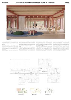 In den Obergeschossen reihen sich die Unterrichtscluster als eigenständige pädagogische Einheiten entlang der Haupttreppen und der inneren Erschließung. Jedes Cluster gruppiert sich um ein zentrales Forum als gemeinschaftliche Mitte und wird durch Transparenz, kurze Wege und vielfältige Lernorte geprägt. Terrassen sind als Erweiterung der Lernlandschaft angelegt und unterstützen verschiedene Lernsettings. Insgesamt entsteht durch viel sichtbares Holz und durch den Außenraumbezug eine wohnliche Atmosphäre. Diese Qualitäten prägen das Raumgefühl und schaffen ein warmes, ruhiges Lernumfeld mit hoher Aufenthaltsqualität.