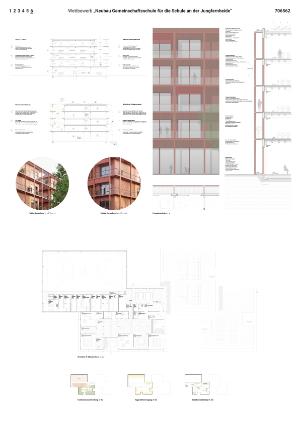 Ausgangspunkt ist eine klare, gut organisierte Gebäudestruktur mit hoher räumlicher Lesbarkeit: Die lineare Erschließung, die eindeutige Zuordnung der Bereiche und die Clusterlogik schaffen funktionale Robustheit und unterstützen flexible Nutzungen im Schulalltag. Zugleich werden Komfort und Gesundheit über gute Tageslichtversorgung, differenzierte Lern- und Aufenthaltsorte sowie den konsequenten Bezug zum Außenraum gestärkt; Terrassen- und Außenbereiche sind als Erweiterung der Lernlandschaft mitgedacht. Die geplanten dezentralen Lüftungslösungen in lärmbelasteten Fassadenbereichen sichern eine hohe Raumluftqualität auch bei geschlossenen Fenstern und unterstützen damit den Nutzerkomfort. Für den Themenblock Ressourcen und Energie werden architektonische und freiraumplanerische Maßnahmen zusammengeführt: Die Holz-Hybrid-Konstruktion reduziert graue Emissionen und stärkt den Einsatz nachwachsender bzw. ressourcenschonender Materialien; Retentionsdächer, Begrünung und die konsequente Regenwasserbewirtschaftung (Rückhalt/Versickerung auf dem Grundstück) fördern den natürlichen Wasserhaushalt und die Klimaresilienz.