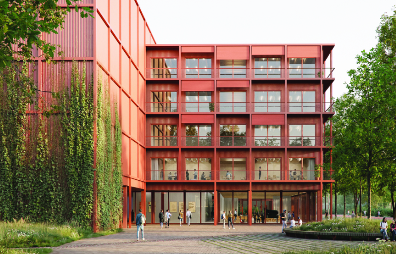 Das Erscheinungsbild des Neubaus wird durch eine klare, robuste Fassadenkomposition geprägt. Eine rote Metallverkleidung bildet die wettergeschützte Gebäudehülle und nimmt bewusst Bezug auf die industrielle Prägung der Siemensstadt. Der Fassade ist umlaufend ein Terrassenband als Balkonzone vorgelagert. Diese Außenraumstruktur übernimmt mehrere Funktionen zugleich: Sie ermöglicht den direkten Austritt aus den Clustern und stärkt damit den Alltagbezug zwischen Innen- und Außenraum. Zugleich bietet sie Abstellmöglichkeiten für Pflanztröge und unterstützt die Begrünung mit Kletterpflanzen – bis hin zu nutzbaren „grünen Erweiterungen“ der Lernbereiche, etwa als Grünes Klassenzimmer in direkter Nähe der Cluster. Zusätzlich vereinfacht die umlaufende Balkonzone die Bewirtschaftung und Pflege der Fassaden und wirkt als Pufferzone zwischen Außenklima und Innenraum.