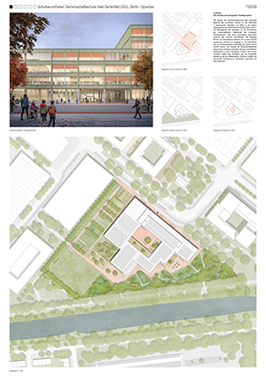 Der Neubau der Gemeinschaftsschule Insel Gartenfeld begrenzt den unmittelbar nördlich an die Planstraße 1 angrenzenden Stadtplatz und bildet so ein starkes Gegengewicht zum historischen Industriebau weiter nördlich. Die Besonderheit des Schulbaus ist die Erschließung der unterschiedlichen Teilbereiche des komplexen Raumprogramms über einen großzügigen geschützten Innenhof, den zentralen Ankunftsplatz. Die Eingänge Primar- und Sekundarstufe befinden sich an den Innenhof angrenzend, während die Eingänge zu den Sporthallen und zum Verbundstandort unabhängig von außen erreicht werden können. Der Neubau der Gemeinschaftsschule zeigt sich als Holz-Beton-Hybridbau mit einer vorbewitterten Holzfassade in einem freundlichen Grünton. Der spürbar modulare Aufbau des Schulbaus und die horizontale Gliederung der fein differenzierten Großform schaffen die gewünschte Verbindung zur industriellen Geschichte der Insel Gartenfeld.
