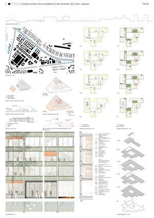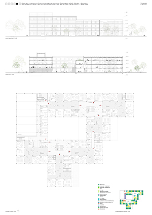 Das differenzierte Erschließungssystem besteht aus zwei separate Eingangsbereichen für Primar- und Sekundarbereich. Das zentrale Foyer für die gesamte Gemeinschaftsschule mit der angrenzenden Mensa, dem zuschaltbaren Mehrzweckraum und der Bibliothek befindet sich angrenzend an den Zugang zur Sekundarstufe. Die Schülerinnen und Schüler der Primarschule erreichen die zentralen Einrichtungen über einen im EG öffentlichen Flur. Die Lerncluster der Primarschule sind, wie gefordert zu Doppelcluster mit zentralem Lehrerstützpunkt zusammengefasst und über 4 Ebenen verteilt angeordnet. Die Verteilung der Schülerinnen und Schüler in der Primarschule erfolgt dem Alter entsprechend von unten nach oben, wobei die ganz kleinen Schülerinnen und Schüler in räumlicher Nähe zum Erdgeschoss lernen. Den größeren etwa 12 Jahre alten Kindern ist der Weg vom 3.OG zu den Pausenflächen zumutbar.