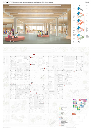 Über das Foyer Ost sind die öffentlichen Bereiche der Schule und die Aufgänge zu SEK I und II erreichbar. Angrenzend an Foyer, Mensa und zu schaltbaren Mehrzweckbereich, sowie Bibliothek liegen die Lernwerkstatt Kochen, der Fachbereich Musik und Wirtschaft, Arbeit, Technik (WAT). Die Küche mit Ausgabetresen grenzt an die Mensa an und kann von Osten aus separat angedient werden. Die Lernküche ist direkt angrenzend. Das Foyer West erschließt ein Doppelcompartment des Primarbereichs. Der Verbundstandort mit seinen der Allgemeinheit zur Verfügung stehenden Räumlichkeiten liegt in der Nordecke mit guter Ausstrahlung in das zukünftige angrenzende Wohngebiet.