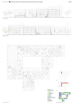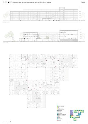 Die Sporthallen können sowohl von innen über die Foyers der Schule als auch für die Sportvereine über einen separaten Eingang von der öffentlichen Seite des Durchgangs erschlossen werden. Insgesamt 3 Aufzüge, sowie hinreichend breite und gut belichtete Flure sichern die barrierefreie Erschließung der neuen Schule.
