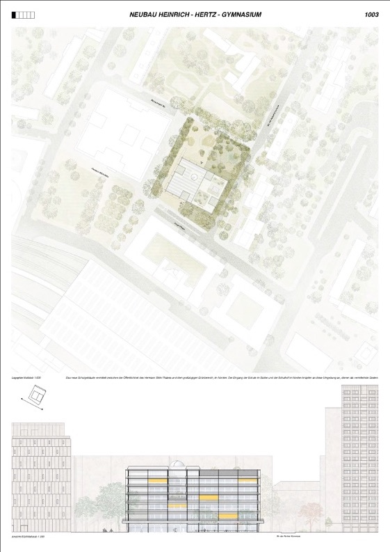 Der Neubau des Heinrich-Hertz-Gymnasiums spielt bei der Neuordnung des Areals nördlich des Ostbahnhofes eine wichtige und eigenständige Rolle. Die großmaßstäbliche Wohnbebauung, das kürzlich transformierte Kaufhausgebäude und der geplante Rathausblock bilden zwei starke freiräumliche Sphären. In diesem Kontext muss sich das neue Schulgebäude behaupten können. So vermittelt es zwischen der Öffentlichkeit des Hermann-Stöhr-Platzes und dem ruhigeren und großzügigen Grünbereich im Norden. Der Eingang und somit die Adresse der Schule im Süden und der Schulhof im Norden knüpfen an diese Umgebung an, dienen als vermittelnde Gesten. Folglich öffnen sich Aula und Mensa der Schule zum öffentlichen Raum. Sie bilden eine einladende Geste, sind ein Schaufenster für das Schulleben. Das offene Erdgeschoss bildet eine Passage zwischen dem Vorplatz und dem Schulhof. Das Gebäude wird in seiner Anmutung der Rolle als potenzieller Baustein öffentlichen Lebens gerecht und kann durch unkomplizierte Schaltbarkeiten einfach und öffentlichkeitswirksam für externe oder außerunterrichtliche Aktivitäten genutzt werden.