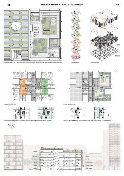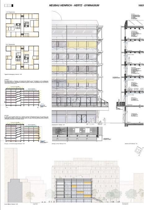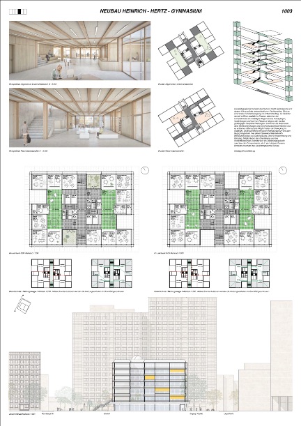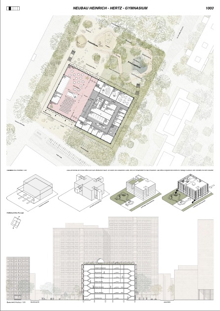 Ausgangspunkt des Konzepts für das neue Schulhaus sind der anspruchsvolle, innerstädtische Kontext in Verbindung mit einem knapp bemessenen Entwurfsgebiet und die daraus resultierende vertikale Organisation der Berliner Compartmentschule in Adaption auf das naturwissenschaftliche Profil des Heinrich-Hertz-Gymnasiums. Der Entwurf versammelt die kleinen Organismen der Fachbereiche und Compartments in einem kompakten städtischen Baukörper, der in dem heterogenen und großmaßstäblichen Kontext eine eigenständige Präsenz entwickeln und trotz der geringen Grundstücksgröße durch seinen kleinen Fußabdruck einen sehr qualitätsvollen Außenbereich modellieren kann. In dieser Ausformulierung trägt das Gebäude funktionalen Anforderungen des speziellen pädagogischen Konzepts Rechnung, verleiht dem naturwissenschaftlichen Profil des Gymnasiums einen Ausdruck im Stadtraum und leistet einen profilierten Beitrag zur Nachhaltigkeit im Bauwesen.