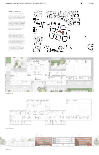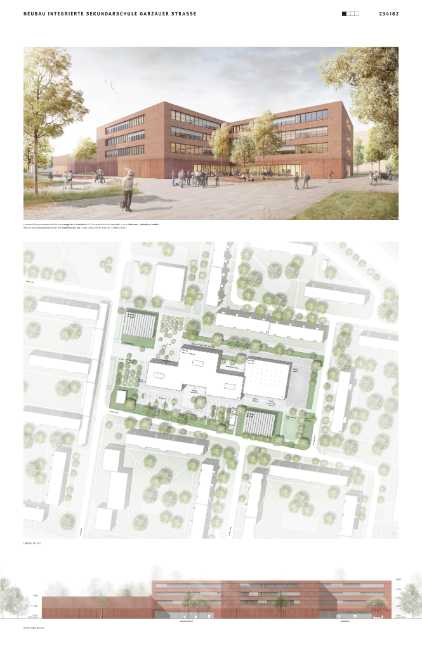 Die Struktur der viergeschossigen Baukörper ist sehr kompakt gehalten, so dass die Freiräume großzügig mit Sitzgelegenheiten, Grünflächen, altem Baumbestand und durch einzelne Neupflanzungen gestaltet werden können. Schüler:innen, Lehrer:innen und Besucher:innen erreichen die Schule über einen freien Vorplatz, der in der Verlängerung des vorhandenen „Baumplatzes“ liegt. Im Erdgeschoss befindet sich das weitläufige Schulfoyer, welches zur zentralen Erschließung in der Mitte des Hauses führt. Hier sind auch Mehrzweckraum und Mensa verortet, die jeweils über eigene Außenräume verfügen. Ihre Flächen sind zusammenschaltbar – sie bilden bei Bedarf einen beträchtlich großen, zusammenhängenden Raum, der vom Vorplatz bis zum Außenbereich der Mensa reicht. Die öffentlichen Kernfunktionen mit den Musikräumen, der Bibliothek und den Räumen für Wirtschaft-Arbeit-Technik sind ebenfalls vom Schulfoyer aus einseh- und erreichbar.