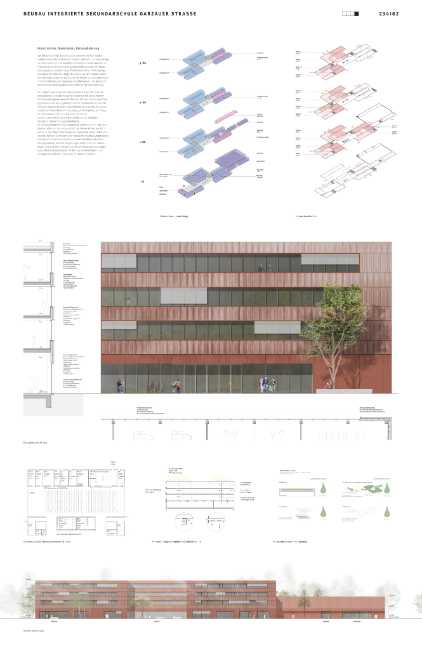 Erdgeschoss formen die Fassaden durch einen Wechsel von transparenten und geschlossenen Bereichen mit faserarmierten Sichtbetonfertigteilen einen Sockel aus. Die Fassaden in den Obergeschossen sind als vorgefertigte Holzrahmenkonstruktionen mit vertikaler farbbeschichteter Holzverkleidung entworfen. Die Konstruktion und Materialwahl in Holz trägt zur Verringerung der Folgen des Klimawandels bei und soll auch mit seinen haptisch-atmosphärischen Eigenschaften einen wichtigen Beitrag für dieses Schulgebäude leisten. Im Inneren bestimmen helle freundliche Oberflächen mit robusten Eigenschaften das Erscheinungsbild der Schule: Böden aus Sichtestrich in den öffentlichen Bereichen, Kautschuk in den Unterrichtsräumen, Kerne in Sichtbeton und robuste Wandbekleidungen sowie einzelne Holzeinbauten und freistehendes Mobiliar zur flexiblen Raumgestaltung. Gezielte Verglasungen in Bereichen der Kunst-, Musik- und einzelner Fachräume verleihen der Schule den Status einer offenen Lernlandschaft, fördern die Kommunikation und ermöglichen ein breites Spektrum an Unterrichtsformen.