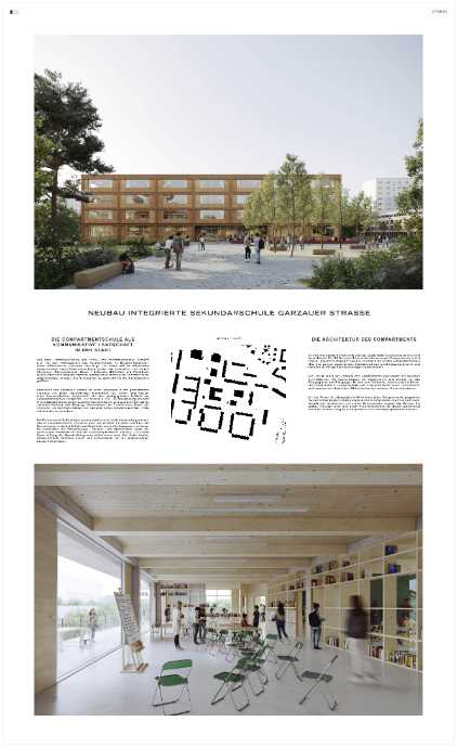 So wie die Schule eine Stadt in der Stadt ist, bildet jedes Compartment eine Schule in der Schule. Die ISS Garzauer Strasse besteht aus sechs Compartments in drei Etagen. Umlaufend begrünte Balkone verbinden die beiden Compartmentflügel über den zentral angeordneten kaskadenartigen Erschliessungsbereich und schaffen vielfältige Sichtbeziehungen untereinander.