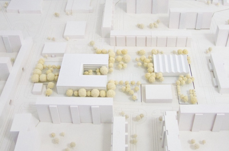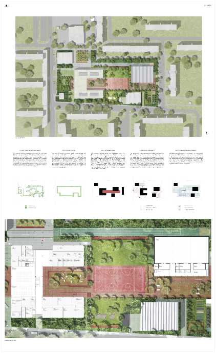 Schulhaus und Sporthalle werden als klare Baukörper in den gewachsenen Freiraum mit altem Baumbestand eingebettet und folgen dem Prinzip einer kommunikativen Landschaft, die dem pädagogischen Leitbild der Compartmentschule entspricht. Die einzelnen Teile, ob großmaßstäblich oder kleinmaßstäblich betrachtet, schaffen Kommunikation und graduelle Übergänge zwischen Aktivität und Rückzug, Öffentlichem und Geschütztem, Sport und Erholung, um Nachbarschaften und Gemeinschaften unterschiedlicher Größe miteinander zu vernetzen.