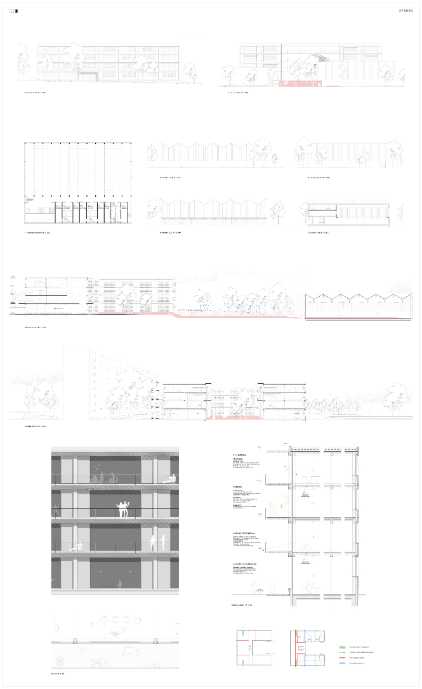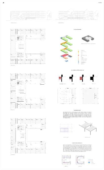 Die erforderlichen Brandabschnitte ergeben sich aus der räumlichen Organisation des Baukörpers. Durch die Teilung in Cluster, die durch feuerbeständige Wände und Türen getrennt sind, entstehen sichere Bereiche, die einer Ausbreitung von Feuer und Rauch vorbeugen. Die erdgeschossige Mehrzwecknutzung bildet ebenso wie der mehrgeschossige Erschließungsbereich eigene Brandabschnitte. Grundsätzlich gilt, dass alle Flächen > 400 m2 durch Rauchschürzen und -vorhänge in Rauchabschnitte unterteilt werden. Rauch kann sich so nicht unkontrolliert ausbreiten und die Flucht und Rettung der Personen behindern.