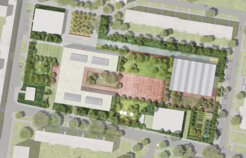 Der Freiraum und die Baukörper werden um das zentrale Aktionsband organisiert, das in Grundstücksmitte von West nach Ost verläuft. Es stiftet Identität und Orientierung, verbindet Schule und Sporthalle sowie alle Nutzungen im Freien. Es strukturiert die Erschließungs-, Pausen-, und Sportflächen sowie die großzügigen Rasenflächen mit den schattenspendenden Bäumen. Ein grüner Saum entlang der Grundstücksgrenze bildet einen etwa fünf Meter breiten Schwellenraum zwischen Schule und Straßenraum, der die kommunikative Landschaft einfasst.